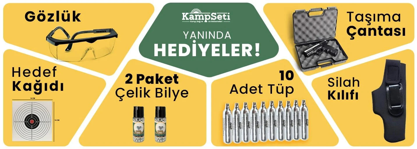 - Emniyet modu vardır ve 1 şarjör 15 mermi kadar destekler 12 gramlık bir CO2 ile 70-80 kadar atış imkanı sağlar.