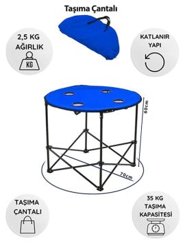 KampSeti Yuvarlak Katlanır Kamp Masası-Taşıma Çantalı Piknik Masası(70 X 60 Cm) Mavi